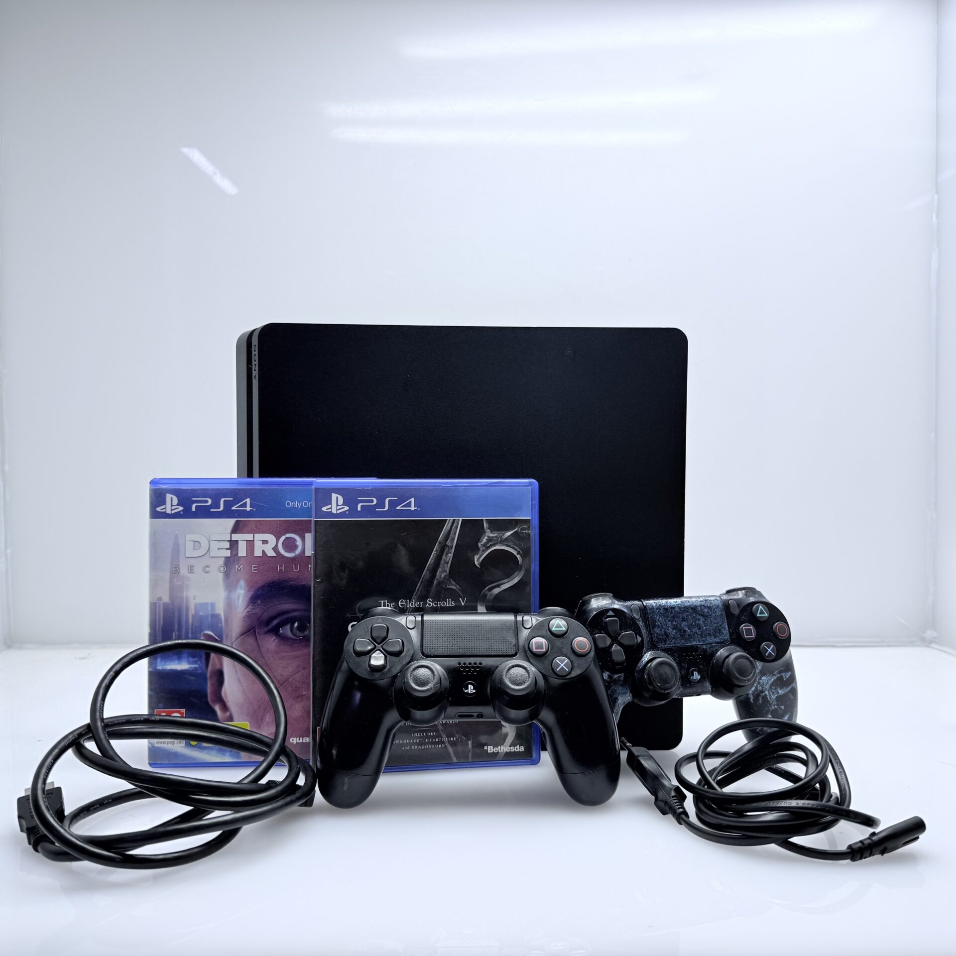 Accessories: Includes 1 x HDMI Cable, 1 x Power Cable, 2 x Games (The Elders Scrolls V: Skyrim and Detroit: Become Human), 2 x Controllers (one with markings-(glitters) ). Box not included.